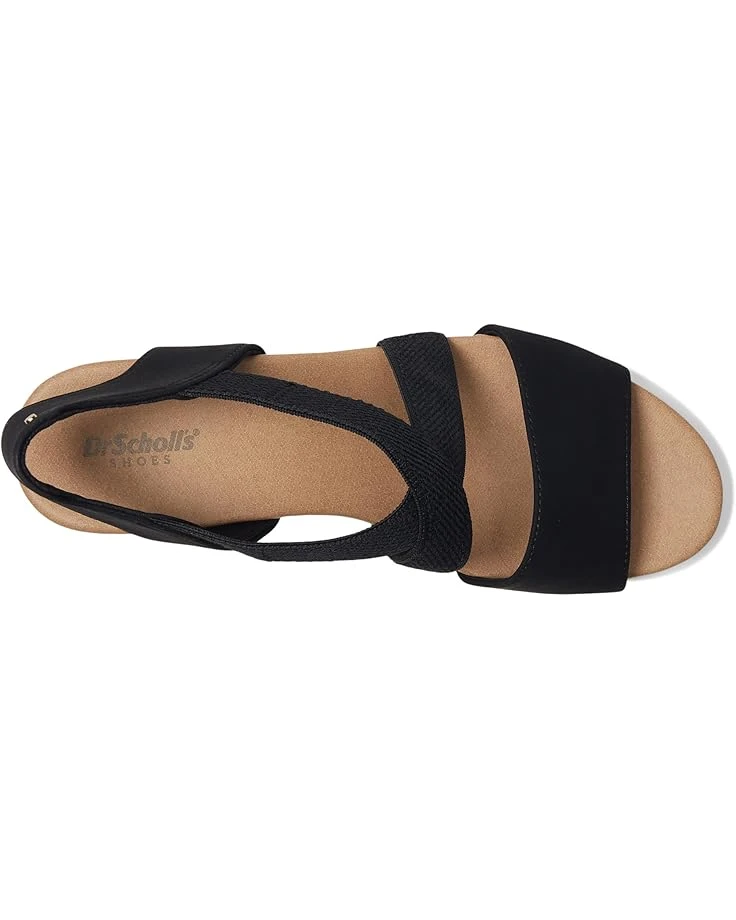 - The Dr. Scholl’s® Just Cute, womens strappy wedges with a sporty hybrid design and casual comfort. Crafted from canvas upper, fabric lining, and EVA insole, this pair of sandals features open round toe, slips on with stretch gore instep strap for easy on/off, flexibility, and secure fit. Insole Technology with cushioning, comfort, and arch support.